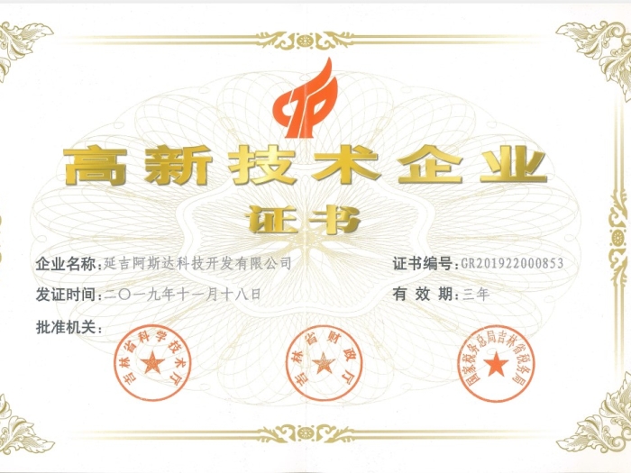 연길아사달회사가 2019년 11월 18일에 국가 고신기술기업에 당선 되였습니다.